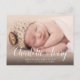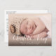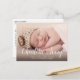 This pretty modern birth announcement postcard features elegant calligraphy and a large photo. The front of the postcard showcases your newborn with a horizontal full-bleed photo and the baby's name written in white script lettering (the design works best with darker photos that will allow the white lettering to be read easily). Below, add birth details and your names. On the back, you can write a custom message to loved ones.