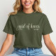 Show off your Maid of Honour pride with this chic T-shirt. Featuring a modern retro script on a fatigue green t-shirt, it’s the perfect Outfit of the Day for bachelorette trips or casual bridal shower looks. Comfortable and stylish, it’s a must-have for trendy brides and their crew. || Click on "personalise this design" to add your details. || Matching wedding party gifts, Bridal Shower Accessories, and Bachelorette Party must-haves are available. Please message us with questions or to request custom items.