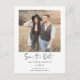 Simple photo save the date postcard featuring the couples photograph in a simple white frame on the front and a modern calligraphy heading. The back of the postcard is organized for the couples message etc..