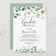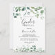 This calligraphy script foliage gender reveal party invitation is perfect for a modern baby gender reveal. The design features watercolor hand-drawn elegant botanical eucalyptus branches and leaves, arranged in beautiful bouquets and geometric patterns.