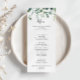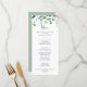 This calligraphy script green foliage dinner menu card is perfect for a modern wedding. The design features watercolor hand-drawn elegant botanical eucalyptus branches and leaves, arranged in beautiful bouquets and geometric patterns.