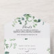 This calligraphy script green foliage wedding all in one invitation is perfect for a simple wedding. The design features watercolor hand-drawn elegant botanical eucalyptus branches and leaves, arranged in beautiful bouquets and geometric patterns.
