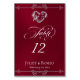 The design features an elegant burgundy background embellished with scroll borders, a heart and placeholders for the table number, couple's names and date of event. Available in several colours for your wedding theme. Designed to coordinate with the Romantic Scroll Hearts & Calligraphy Wedding Collection. To change details, click «Personalise». To move the text or change the text size, font, or colour click «Click to customise further».
