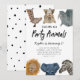 Cute and fun kid's safari animals theme birthday party invitation featuring illustration of safari animals of giraffe, snow leopard, rhino, lion, elephant, and zebra. The text says "calling all party animals." Perfect for a boy's birthday party.