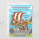 Celebrate your little Viking boy's birthday with this colourful invitation! It features a Viking warrior boy with a horned helmet, wooden shield, and axe. He and some of his ship crew friends are posing in front of a Viking longship. In the back, there's a Scandinavian landscape and a Viking thatched roof house decorated with a skull and dragon heads. In the front, there's a sign that reads PARTY, the boy's wolf pet, and yellow balloons. It's ideal for a Viking-themed birthday party! This Boy Birthday Party invitation is easily customised for your event by adding your details.
