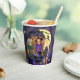 Calling All Witches is a beautifully crafted whimsical Halloween Birthday design on both sites, a different compilation of characters featuring 3 witches making a brew on the front and the back has one witch. Text can be updated on both sides of the paper cup. Beautiful rich colours of orange, brown, and purple with a yellow moon will cheer up your table decor along with pumpkins, flying bats, an owl, and a black cat.