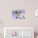 Pink and purple poster featuring a beautiful calliope hummingbird flying over yellow and pink lantana flowers, showing his wings fully outstretched in back and his iridescent magenta throat feathers. Beautiful and unique wall decor for hummingbird, garden and nature lovers. Fun fact: this hummingbird is the smallest bird in North America and is named after the muse Calliope in Greek mythology. Photograph taken in Pasadena, California.