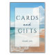 This wedding tabletop sign features a serene beach scene with gentle waves and a sandy shore under a partly cloudy sky, creating a tranquil seaside atmosphere. The design uses soft blues for the ocean and sky, warm beige tones for the sand, and subtle white highlights to suggest sunlight reflecting off the water. A centred rectangular overlay contains the text "CARDS and GIFTS" in large serif letters, with "thank you" written below in a simple sans-serif font, enhancing readability against the background. The overall mood is one of gratitude and relaxation, making it perfect for expressing appreciation at your special event.