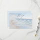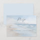 This RSVP card features a serene beach scene with gentle waves and sandy shores under a soft blue sky, creating a tranquil seaside atmosphere. The minimalist yet detailed design uses calming blues, whites, and warm beige tones to evoke peace and elegance. Elegant script typography highlights the "RSVP" at the top, while clean sans-serif fonts provide clear instructions and customisable response options for guests. Perfect for formal events near coastal locations, this card captures the essence of relaxation and anticipation.