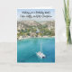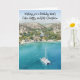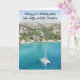 Birthday card with water colour style digital picture of a catmaran boat in blue sea, with coastline and hills behind. Slogan says 'Wishing you a Birthday that’s calm, happy and full of sunshine.'
