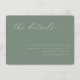 This wedding enclosure card features a minimalist design with a soft, muted green background that creates a calming and sophisticated atmosphere. The layout is centred and balanced, showcasing elegant cursive script for the title "the details" and clean sans-serif text for additional information, ensuring readability and an understated elegance. The absence of decorative elements emphasizes simplicity, making it ideal for conveying essential information in a visually appealing way. Perfect for modern weddings, this card combines contemporary style with functionality, inviting guests to explore further details through a provided website link.