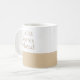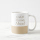 Calm Shores Ahead appears in serif lettering above a sand-beige horizontal band on a white ceramic surface. Inspired by beech-toned neutrals, the clean layout suits morning routines, desk breaks, and quiet kitchen shelves where soft color and structured design feel intentional.