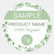 Small round sample product label with lush green leaves and soft green text for beauty products samples, skincare product samples, and other goodies you want to hand out to your loyal customers and clients for supporting your small business and give them a taste of the products you have to offer.