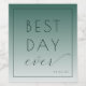 This elegant wedding wine label features a minimalist design with a gradient background transitioning from dark teal to light green. The layout is clean and modern, showcasing the phrase "BEST DAY ever" in bold uppercase letters paired with a stylish cursive script for added sophistication. The typography is crisp and legible, set against ample negative space that emphasizes simplicity and focus. Perfect for celebrating your special day, this label conveys a mood of joy and optimism, making it an ideal choice for commemorating your wedding.
