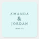 This wedding sticker features a minimalist design with a soft pastel teal background, creating an elegant and serene atmosphere. The layout is clean and balanced, showcasing the names in a modern sans-serif font with ample spacing for readability. A simple ampersand connects the two names, emphasizing unity, while "thank you" is subtly included below, adding a touch of gratitude. The understated style makes it perfect for expressing appreciation at weddings or other formal events.
