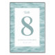This elegant wedding table card features a modern, minimalist design with a calming oceanic theme. The layout centers around a large, bold number "8" framed by a crisp white border, surrounded by soothing wavy lines in shades of teal and aqua. The typography combines a delicate script for the word "table" with clean sans-serif fonts for customizable names and date placeholders, creating a sophisticated look. Perfect for adding a touch of tranquility to your wedding celebration, this card exudes a serene and celebratory mood.