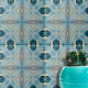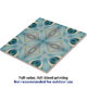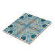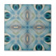 This ceramic tile showcases a complex kaleidoscopic pattern. The design is symmetrical, featuring abstract shapes that are reminiscent of flowers and geometric figures. The tile is adorned with a soothing palette of various shades of blue, teal, cream, and white, which blend harmoniously to create a visually pleasing effect. The central part of the design is chraacterised by overlapping layers that add depth to the overall pattern. Diamond-shaped elements are nestled in the middle, surrounded by petal-like structures. The use of darker tones at certain points provides a striking contrast, enhancing the visual appeal of the tile.