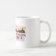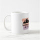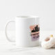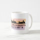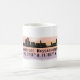Coffee mug features skyline silhouette of Cambridge Massachusetts with map latitude and longitude coordinates on a watercolor splash background,