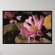 Photographic art of a camellia bloom on stones. Rich pinks, browns and golds in a water colour motif with a decorative border. Available in various sizes with or without framing. By Dwight Bennett from Natureworld Art.