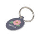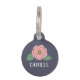 Try out this charming pet ID tag, presenting a lovely floral motif. The tag has a deep grayish background which elegantly sets off the central illustration of a camellia flower in soft pink with green leaves. Below the flower, your pets name is written in a simple yet sophisticated serif font, suggesting that the pet who wears this tag may have an elegant or graceful personality. The overall design of the tag is clean and modern, with a touch of classic beauty, making it a stylish accessory for any pet.