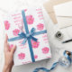 Modern spring flower design personalised wedding gift wrapping paper, featuring watercolor camellia flower art and your own couples names and wedding date in pink, white and yellow. A great way to give a personalised touch to special wedding presents and gifts. Unique watercolor art and design by Sarah Trett. www.sarahtrett.com for www.mylittleeden.com