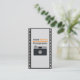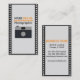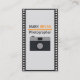 A business card with a film strip as background and camera icon as design. Black and orange text for personalisation of details. A simple, professional and modern business card for photographers or businesses dealing with camera equipment.