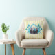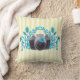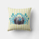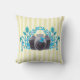 A pillow with a cute watercolor design for shutterbugs. A black camera surrounded by azure blue leaves and butterflies in a pretty decorative arrangement. Set on a pale pastel yellow striped background.