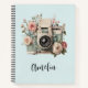 Spiral notebook with a vintage styled camera decorated with flowers. Pastel colors of pink, cream and green.