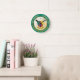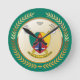 The national Coat of Arms of the Cameroon, is infused into a faux gold rimmed circle, and this circle is set inside a faux gold laurel wreath.