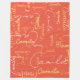 An orange red background colour... pale yellow and white handwritten font styles repeating all over the fabric... a nice and personalised idea for any girl