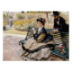 "Camille Monet (1847–1879) on a Garden Bench (1873)" portrays his Monet’s wife, Camille, in a tranquil garden setting. Painted in 1873, the artwork captures Camille seated on a wooden bench amidst lush foliage. The scene exudes a sense of serenity and intimacy, with Camille depicted in a moment of quiet contemplation. Skilled brushwork and use of light and colour imbue the painting with a soft, ethereal quality, enhancing the mood of peacefulness. This intimate portrait invites viewers to share in the beauty and tranquillity of their private moments together in the garden.