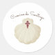 A special round sticker for pilgrims, featuring a scallop shell and the cross of the Camino de Santiago. Join this journey of faith and adventure through Spain.