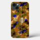 The original collage by ZoeSPEAK on this iPhone 13 Case is a camouflage pattern designed for those times when you want to be noticed. The basic pattern is made of traditional camouflage shapes in muted colours, earth tones of tan, brown and olive drab greens. But throughout this are round shapes emerging through the camouflage in bright cobalt blue. The case is designed as a clutch bag. The edge of the top flap of the purse is decorated with light olive green discs with blue dots in their centres, looking a bit like sequins. The clasp of the bag is a gold oval, curving outward with a highlight in the centre. There is a monogram in black in the centre of the clasp. This is set to personalise, or delete if you wish.