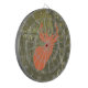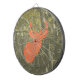 A dart board featuring an illustration of an orange deer over a hunting camo inspired background.