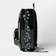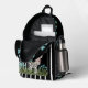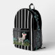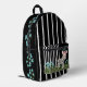 Here’s a fun design that features a black and white striped pattern. On the zippered pouch, there's an adorable zebra, with pink glasses and a pink bow. Along the sides and bottom of the backpack, there's a border of blue flowers.