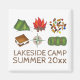 Features an original marker illustration of six classic camping-themed illustrations, including a campfire, trail mix, tent, sleeping bag, s'mores, and compass. Simply personalise with your camp information.