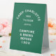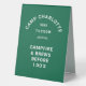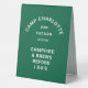 Camp theme bachelorette, personalised forest green table tent sign. Personalise with bride's name, the year of the camp theme bachelorette party/trip and location. The perfect decor / sign for a camp theme bachelorette party. Designed to match our Camp Bachelorette Green & Pink Collection.