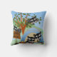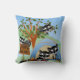 Camp Mischief pillow, so cute and great for kids who love camping and animals! Features a sky blue background, tree, blue tent, cute racoon campers, campfire, and a sign that reads "Camp Mischief".