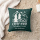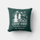 Up your camping game or add a custom touch to your RV or camper with this cute personalised throw pillow. Outdoorsy hunter green pillow features the quote "camp more, worry less" in distressed white lettering beneath a hand drawn illustration of a camping tent set in a pine forest with a crescent moon rising over snow-capped mountain peaks. The perfect way to commemorate a special trip, or for anyone who loves camping, you can customise this throw pillow with your choice of text beneath the design. Add your camping destination, the year, or a family name for a special touch.