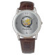 The watch looks really great! Very sharp and well done. The leather band is really nice, though for a man's watch I think it should be longer. Unfortunately, it isn't big enough for my husband's wrist but I will get a replacement because he is very excited to wear it!