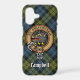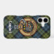 Campbell crest badge surrounded by a strap and buckle over tartan background. Custom text.