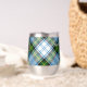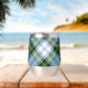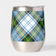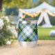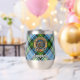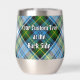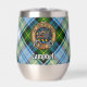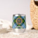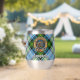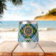 Campbell crest badge surrounded by a strap and buckle over dress tartan background. Custom text on both sides.