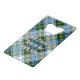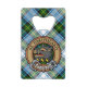 Campbell crest badge surrounded by a strap and buckle over dress tartan background. Custom text on both sides.