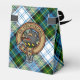 Campbell crest badge surrounded by a strap and buckle over dress tartan. Custom text and monogram.