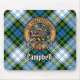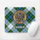 Campbell crest badge surrounded by a strap and buckle over dress tartan background. Custom text.