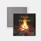 Photograph of a campfire made of sticks, surrounded by rocks, burning against dark night. Customizable text reads, "I Love Campfires."