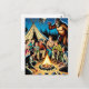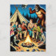 A cute funny nostalgic feeling postcard to keep in touch with a friend or for a postcard collector. People camping telling their scary stories around the campfire as Bigfoot and an alien lingers near. This cute ai art has a fun retro vibe to it.