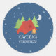Camping birthday party favour stickers with tent, trees and starry night background.