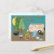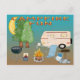 Camping Fun Postcard Features a brown and blue gradient background, pine trees, moon, RV Camper, grill and charcoal, campfire, beach chair, cooler, campground sign. Yellow and orange text is Campfire Fun. Background colour is customisable. Matching products include; Invitations, postage stamps, address labels, envelope seals, greeting cards, postcards, party favour stickers, cake toppers, yard sign are also available in our shop.