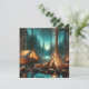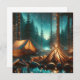 An ai illustration of a camp site by a lake and pine trees with a campfire burning and pretty white fairy lights strung about the trees.